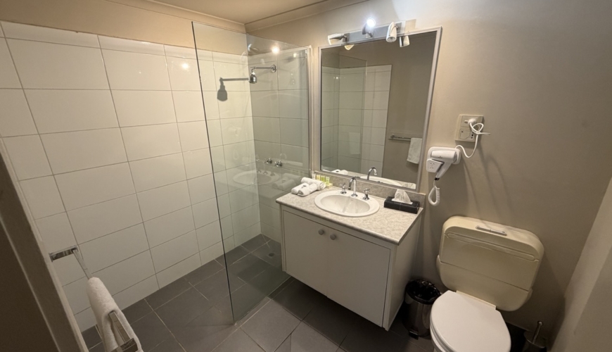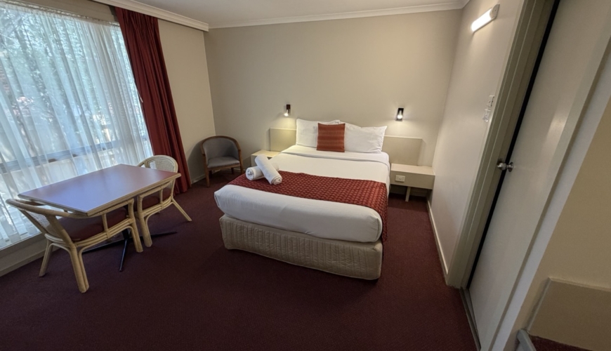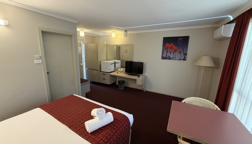 This room has a Queen-size bed fitted with quality linen and a large bathroom with toilet & shower. The suite features both heating & air conditioning. It also features a bar fridge & small seating area accompanied by a flat screen tv with 5 Foxtel channels provided. The room also comes with free-wifi & iron board facilities.