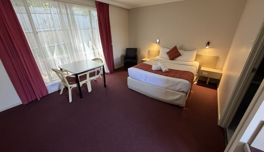 This room has a Queen-size bed fitted with quality linen and a large bathroom with toilet, spa jet bath & shower. The suite features both heating & air conditioning. It also features a bar fridge & small seating area accompanied by a flat screen tv with 5 Foxtel channels provided. The room also comes with free-wifi & iron board facilities.